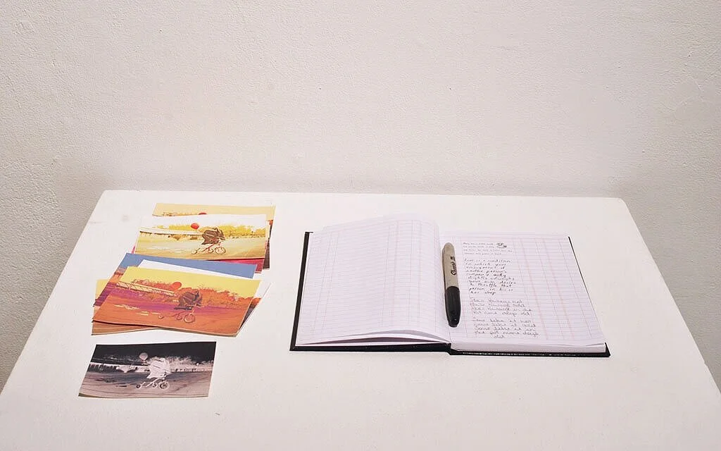 LEAVE A PRAYER, TAKE A PRINT - Modified Images of "The Suit" printed on canvas, Donated limericks, poems, wishes and observations left in a ledger book. 20" x 20" x 42"